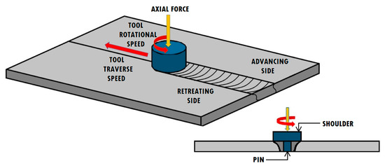 One of the most important process parameters is the geometry of the tool. The tool consists of a specially designed pin and shoulder. The movement of the plasticized material depends on its geometrical features [30]. Its geometry also conditions the workpiece thickness, possible materials to be welded, and type of the joints [7]. The pin is an element of the tool that is directly plunged between the surfaces of the workpieces. It is plunged into the material until the shoulder reaches the contact with the surface of the components [31]. The tool design governs the process loads and microstructure of the weld, when from the heating aspects, the most important parameter is a ratio of a shoulder diameter to a pin diameter [32]. The FSW method is mostly characterized by two parameters related to its kinematics—rotational speed (ω) and traverse speed (v) along the joint line [33]. Selecting the optimum tool traverse and rotational speed is a crucial concern in the design of the FSW process.