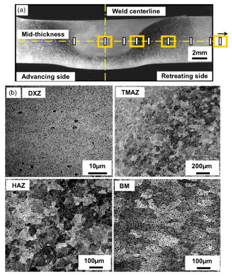 (a) Typical weld macrostructure of 6061–T6 Al alloy in FSW, (b) microstructure of the joint-stir zone (DXZ, dynamic recrystallized zone), TMAZ, HAZ, and BM taken at yellow square marks shown in (a) [27].