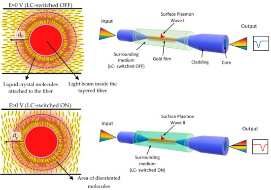 - Florek, M.; Stasiewicz, K.; Korec, J.; Moś, J.; Strzeżysz, O.; Garbat, K.; Jaroszewicz, L. Tapered fiber optic devices with liquid crystal cladding. Proc. SPIE 2019, 11045, 110450E. [Google Scholar]