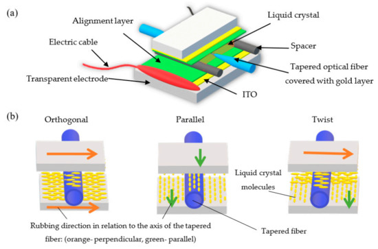 - Moś, J.E.; Korec, J.; Stasiewicz, K.A.; Jankiewicz, B.; Bartosewicz, B.; Jaroszewicz, L.R. Research on Optical Properties of Tapered Optical Fibers with Liquid Crystal Cladding Doped with Gold Nanoparticles. Crystals 2019, 9, 306. [Google Scholar] [CrossRef]