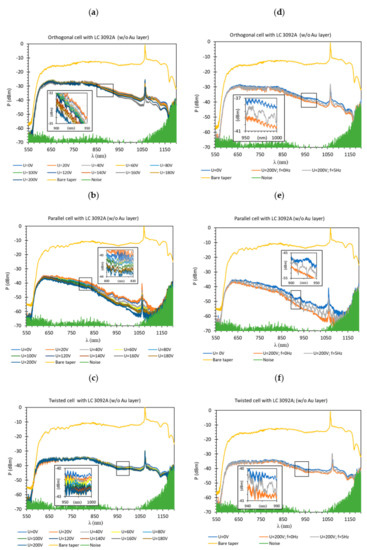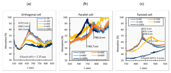 - The initial molecules arrangement inside the LC cell had a significant influence on the occurrence and location of the resonant peak. For the orthogonal cell a resonant peak occurred at 660 nm, for the parallel cell at 770 nm and for the twisted cell at 840 nm.