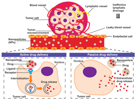 The schematic representation of the basic concept of the active and passive drug delivery systems in the tumor niche.