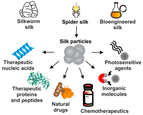Due to their excellent properties, silk-based carriers have been employed for the delivery of numerous therapeutic substances implementing different approaches to treat cancer. It includes particles carrying chemotherapeutics, nucleic acid-based therapeutics, plant-derived agents, therapeutic proteins or peptides, inorganic compounds, as well as photosensitive molecules (Figure 2). In this review, we summarize the current status of development of drug delivery systems that are based on proteins derived from silkworms’ cocoons and spidroins which application is focused on systemic cancer treatment.