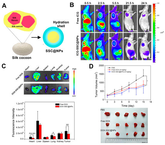 Hydrophilic silk sericin-based nanoparticles (SSC@NPs) in the treatment of cancer. (A) Schematic illustration of SSC@NPs. (B) The fluorescence imaging of mice bearing MCF-7 tumors at 24 h after intravenous administration of free dye indocyanine green ICG or ICG-SSC@NPs. The tumors are pointed with white circles. (C) Top: ex vivo images of major organs and tumors resected from HepG2-bearing mice after 24 h of treatment with free Dox and Dox-loaded DOX-SSC@NPs (NPs contained 2.5 mg/kg of Dox); Bottom: the graph demonstrating Dox distribution in major organs and tumors analyzed at 24 h post-injection. (D) In vivo therapeutic efficacy Dox-loaded DOX-SSC@NPs in reference to control Phosphate buffered saline PBS and free Dox in HepG2 tumor-bearing animals. Top: The time dependent tumor volumes after treatment. Bottom: Image of resected tumors. NS, not significant; * p < 0.05. Reproduced with permission [66]. Copyright, 2018, Elsevier.