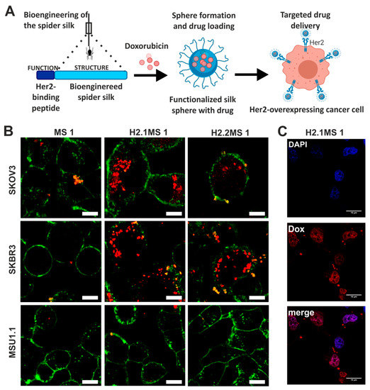 Doxorubicin was also delivered by nanoparticles made of bioengineered spider silk derived from N. clavipes. Florczak et al. developed the targeted drug delivery system based on the silk spheres MS1 derived from MaSp1 spidroin of N. clavipes spider that were functionalized with H2.1 and H2.2 peptides, recognizing Her2 molecule overexpressed on cancer cells (Figure 4) [71]. The silk spheres formed by salting-out with potassium phosphate, with sizes ranging from approximately 300 to 400 nm, were loaded with Dox with high incorporation efficiency. Dox content was approximately 350 ng per µg of spheres, and pH-dependent drug release up to 15 days was observed [71]. The functionalized nanoparticles efficiently delivered Dox to the cancer cells overexpressing Her2 (ovarian cancer cells SKOV-3 and breast cancer cells SKBR-3) what induced significantly higher cytotoxicity in these cells as compared with other cell lines without Her2-overexpression (MSU1.1 fibroblasts) and with control spheres without specific ligand [71]. The binding of the H2.1MS1 particles to Her2 molecule initialized the endocytosis process, and spheres were transported to endosomes and then to lysosomes [30]. Moreover, it was shown in vitro that spheres degradation occurred in the lysosomes due to the enzymatic activity and acidic environment [30]. Hence, Dox was delivered intracellularly (via H2.1MS1 particles), localized in nuclei (Figure 3), and killed the cells more efficiently than Dox released in the environment from non-targeted MS1 particles [71]. Accordingly, the developed system, based on the functionalization of silk with a ligand that targets tumor molecules, could increase the therapeutic index of chemotherapeutic agents against cancer cells. Simultaneously it could reduce the toxicity in healthy tissues. Similar results were obtained when the nanoparticles were prepared based on the blends of the two functionalized silk types (H2.1MS1 and H2.1MS2) [72]. MS2 is a bioengineered silk inspired on the Major ampullate Spidroin-2 (MaSp2) protein originated from N. clavipes spider [73]. The blending strategy was introduced to optimize the physical properties of the carriers, resulting in smaller (~250 nm in diameter), more uniform, spherical, and stable nanospheres [72]. Further improvement of these particle properties was achieved when the microfluidics system was implemented for their production. It allowed a more controlled manufacturing process of silk spheres to obtain particles of reproducible characteristics [74]. This DDS was additionally improved by double functionalization of bioengineered silk [75]. The functionalized MS2 silk containing a DOX peptide with an affinity for doxorubicin (DOXMS2) was blended with the H2.1MS1 silk that provides specificity towards cancer cells. These self-assembled nanoparticles (DOXMS2-H2.1MS1) showed a size below 400 nm in diameter, the improved control of Dox binding and release, and were taken-up explicitly by Her2-positive cancer cells (SKBR-3) [75]. Particles that release less Dox at neutral pH are critical to reducing the release of the drug into the circulation in vivo before the carrier reaches the tumor. It is of great importance in anti-cancer strategies development.