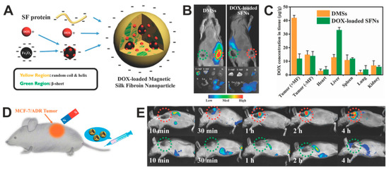 The use of magnetic silk spheres for targeted in vivo drug delivery to the tumor was indicated by Tian et al. [140]. The spheres were made by the salting-out method with potassium phosphate buffer and consisted of B. mori silk fibroin, magnetic particles, and Dox. The particles had an average size of 130 nm and a relatively narrow PSD. The presence of IONPs enabled the magnetic guiding of composite particles and their accumulation in MCF7/ADR multidrug-resistant breast cancer (Figure 5). The targeted chemotherapy caused the inhibition of tumor growth and increased the survival of treated mice compared to the free Dox or administration of particles without MF application [140].