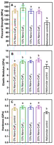 - Xu, H.H.; Moreau, J.L.; Sun, L.; Chow, L.C. Strength and fluoride release characteristics of a calcium fluoride-based dental nanocomposite. Biomaterials 2008, 29, 4261–4267. [Google Scholar] [CrossRef]