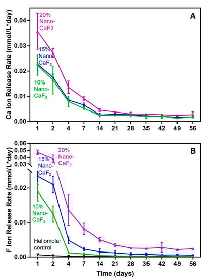 - Xu, H.; Moreau, J.L.; Sun, L.; Chow, L.C. Novel CaF2 nanocomposite with high strength and fluoride ion release. J. Dent. Res. 2010, 89, 739–745. [Google Scholar] [CrossRef]