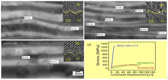 (a) HRTEM image of the Nb-Cu multilayers with n = 11, (b) n = 12 and (c) n = 13 ARB iterations. (d) UTS for sample with n = 13 ARB iterations as compared with their annealed constituents. Insets shows HRTEM images of the multilayers at the interface.