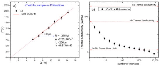 Previous studies suggest that interfaces between metallic materials with considerable differences in their lattice constants and structures would possess a high interfacial thermal resistance [27,28,29,30,31], and if combined with high interface content via multilayers, one would expect a very low κ. Figure 3a shows the ΔT–Q transfer curve for sample with n = 13 iterations. Using the geometrical parameters, and the slope which represents the thermal resistance, a value of κ ∼ 0.81 W/mK was obtained. By a similar procedure, the κ of the multilayer samples from n = 1 to n = 12 was measured.