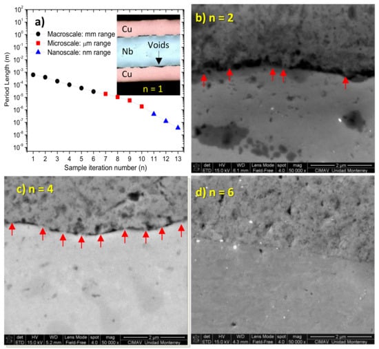 Figure 4a shows the period length as a function of the iteration number n for the ARB Cu-Nb composites. It can be seen that period length approximately spans over three scales: mm range for 1 ≲ n ≲ 6, μm range for 7 ≲ n ≲ 10 and nm range for 11 ≲ n ≲ 13. Thus, only samples for n ≳ 11 must experience significant ITR effects, which means that the second term in the right side of Equation (2) tends to zero in the mm and μm range. Therefore, the drastic reduction observed in κ for the ARB Cu-Nb composites with n ≲ 10 is linked to the TCR term in Equation (2). The inset in Figure 4a shows an optical image for the sample with n = 1 iteration, contact points and voids are evident at the interfaces. Moreover, Figure 4b–d shows SEM images for samples with n = 2, n = 4 and n = 6 iterations, respectively. Clearly, when pressure on the interface is increased via ARB process, the points in contact are deformed and they increase both in size and number, as highlighted by the red arrows in the images for samples with n = 2 and n = 4. Hence, the interfaces between metals become gradually in total contact because of the reduction of the surface’s roughness, as shown for a sample with n = 6.