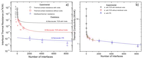 Finally, with these quantities α, np and δi, the magnitude of RTCR can be predicted from Equation (3). Experimental thermal resistance at interface for the whole set of samples is shown in Figure 6a as open symbols. Such values were extracted from the effective thermal conductivity data shown in Figure 3 along with Equation (2). The black solid line and open circle symbols represent the modeling and experimental data respectively for samples with 1 ≲ n ≲ 6 iterations. Evidently, beyond n ≳ 7, the model given by Equation (3) deviates significantly. It is worth mentioning that because voids at the interface diminish as the iteration number increases, it was possible to accomplish reasonably good modeling results only for samples with n ≲ 6.