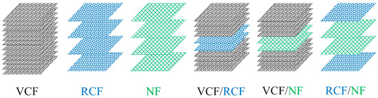 Vf increased in a trend of VCF > NF > RCF, which can be explained by the lower packing densities and discontinuity of fibers in RCF and NF with respect to VCF. The void content followed a trend of NF > RCF > VCF, which can also be explained by fiber discontinuity and a relatively low level of fiber alignment in RCF, while NF is also characterized by discontinuous fibers and a poor interfacial compatibility between the fibers and the matrix. The structure of each hybrid laminate represents a synthesis of the morphological features inherent to each constituent material present in the laminate, which resulted in an averaging of the Vf for each hybrid laminate, while the Vf of each constituent layer was unaffected. The void content of the hybrid laminates showed a similar trend to the Vf with an apparent averaging between each of the constituents.