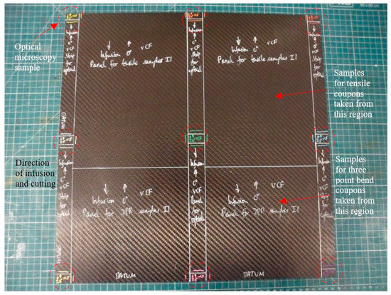 Post-modal analysis panels were further cut into tensile and three-point bend coupons as well as optical microscopy samples, as shown in Figure 4. All cutting was undertaken in the direction of laminate infusion so that the cross-sections of all coupons and optical microscopy samples were perpendicular to the direction of laminate infusion. For laminates containing RCF, they were tested along the principal direction. In this manner, a total of nine optical microscopy samples were obtained from the center, edges and corners of each panel, as highlighted with red circles in Figure 4.