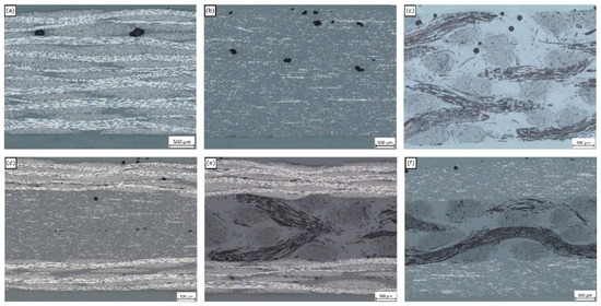 Representative optical micrographs for each laminate are given in Figure 5. The pure laminates shown in Figure 5a–c all show macroscopic voids towards the top surface of the laminate—this could be explained due to buoyancy effects prior to curing. Hybrid laminates exhibited a resin-rich layer at the interface between constituent layers that was not observed in the pure laminates. An explanation for this is due to the disorder in geometrical packing caused by the combination of differently shaped fiber architectures, as was observed by Bachmann et al. in hybrid flax and recycled carbon fiber laminates [35]. While this resin-rich layer might represent an unwanted parasitic mass in the context of lightweighting, the authors speculate that it might offer a mechanism for increasing interlaminar shear strength by blunting crack propagation between laminae. This could be a beneficial feature for increasing impact resistance, although this would have to be investigated as part of further work.
