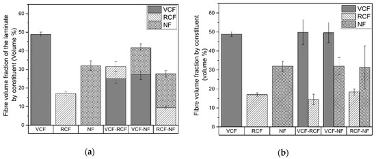 The mean fiber volume fractions of each laminate by constituent are given in Figure 6a. The mean fiber volume fractions (Vf) for the pure laminates are 48.9%, 17% and 32% for VCF, RCF and NF laminates, respectively. The larger Vf for woven carbon and flax relates to the tighter packing density of their woven structures, while the RCF fabrics have a lower packing density and discontinuous fibers, resulting in a lower Vf. The NF fabric is made from low-twist yarns without continuous fibers, which minimizes the fiber-packing density, resulting in a lower Vf compared to VCF laminates.