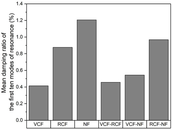 At 1.21%, 0.88% and 0.41%, the respective mean damping ratios of the first ten modes of resonance for pure natural, recycled carbon and carbon fiber laminates are inversely proportional to the modulus of the reinforcing fabric, as shown Figure 8. This is consistent with the expectation that the damping ratio should be inversely proportional to the stiffness of the panel. Specifically, panels with a greater volume fraction of stiffer fibers and weaves with planar fiber alignment are characterized by higher structural rigidity and therefore lower damping ratios. The mean damping ratios for the hybrid laminates are characterized by a negative synergy that is dominated by the material of the outermost layer and this trend is consistent with that observed for carbon–flax hybrids with stiffer plies on the outermost layers.