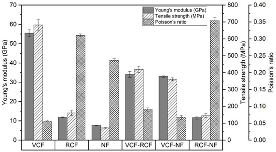 As shown in Figure 9, the Young’s modulus and tensile strength of pure laminates were proportional to the reinforcement stiffness and respective laminate Vf. The highest values were recorded for VCF, followed by RCF and NF.
