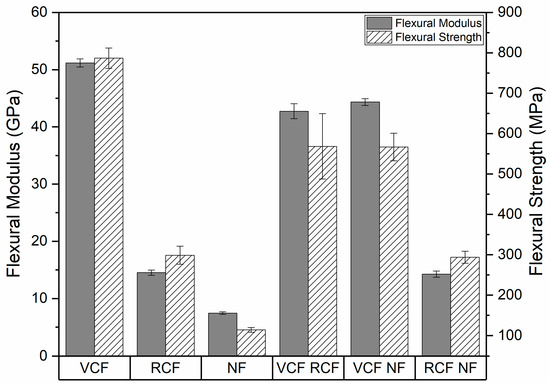 The flexural modulus and strength of the pure and hybrid laminates are shown in Figure 10. In a similar manner to tensile strength and Young’s modulus, the flexural strength and modulus of pure laminates were highest for VCF, followed by RCF and NF. Strong positive synergy was observed for the hybrid laminates, which is correlated with the strength and stiffness of the fiber reinforcements in the outermost ply. VCF-RCF and VCF-NF saw a 16.5% and 13.3% decrease in mean flexural modulus and a 27.7% and 28% decrease in flexural strength when compared to pure VCF flexural modulus and strength, respectively. RCF-NF exhibited a 1.8% and 1.6% decrease with respect to pure RCF in mean flexural modulus and strength. This trend is consistent with expectations, since bending stresses are maximal in layers farthest from the neutral axis, and in all the hybrids, the stiffest plies were located in the outermost layers [35].