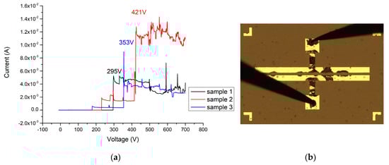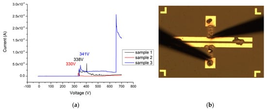 - Shih, C.F.; Hsieh, Y.L.; Chang, L.B.; Jeng, M.J.; Ding, Z.X.; Huang, S.A. Capacitance Characteristics and Breakdown Mechanism of AlGaN/GaN Metal–Semiconductor–Metal Varactors and Their Anti-Surge Application. Crystals 2020, 10, 292. [Google Scholar] [CrossRef]