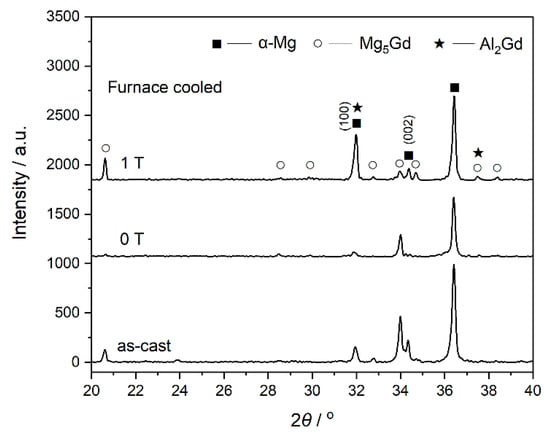 The XRD pattern of the as-cast Mg–Al–Gd alloy is shown in Figure 1. Combined with the OM and SEM observations (Figure 2), the as-cast Mg–Al–Gd alloy was composed of rosette-like α-Mg, eutectic Mg5Gd, and polygonal Al2Gd phases, while no LPSO phase was generated. The α-Mg+Mg5Gd eutectic structure was distributed among the α-Mg grains, and the Al2Gd particles with tales located within the α-Mg grains. The shape and dimension of the Al2Gd particles are similar to those in the Gd-contained AZ31 alloy [23], but these large particles might be unhelpful to the precipitation strengthening. Since the Al2Gd is a ferromagnetic C15-type Laves phase [24,25], it is expected that the magnetic field could be applied to tune the morphology of the Al2Gd particles for precipitation strengthening, with the help of homogenization and cooling. In view of this, the Mg–Al–Gd alloys were homogenized at 620 °C under 0 T and 1 T, respectively, to investigate the effect of the magnetic field on the phase constituent, microstructure, hardness, compression strength, and ductility.