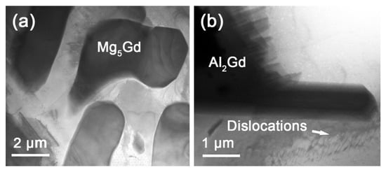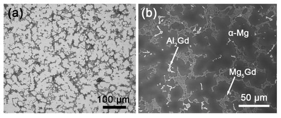 Amongst the RE elements, Gd has the highest solubility in the α-Mg phase, and the commercial Mg–Gd-based alloys exhibited excellent strength and creep resistance. The Mg–Al–Gd alloys have attracted great attention, since the long period stacking-ordered (LPSO) phase might form in the alloys [14,15,16]. However, studies of the Mg–Al–Gd alloys mostly focused on the characterization of the LPSO phase by high-resolution transmission electron microscopy. It is also essential to investigate the mechanical properties of the Mg–Al–Gd alloys by tuning the content and morphology of the Mg–Gd and Al–Gd secondary phases.