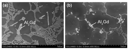 In addition to the α-Mg phase, the morphology of the second phases was also impacted by the magnetic field. The SEM images of the Mg–Al–Gd alloys treated under 0 T and 1 T are shown in Figure 4. Although the content of the Mg5Gd phase at the grain boundaries was reduced in the furnace-cooled alloy under 1 T, the refinement of the α-Mg grains brought about an increasing number of grain boundaries, and the total content of the Mg5Gd phase in the alloy treated under 1 T was increased, which agreed well with the calculation results of the phase content (Table 1). Hu et al. have demonstrated that the mutual diffusion of Mg and Gd was accelerated by the magnetic field [28] for abundant dissolution, which would depress the segregation of Gd atoms. The homogeneous distribution of Gd atoms was the reason for the homogeneous precipitation of the Mg5Gd phase upon cooling. However, the magnetic field hardly affected the size of the eutectic Mg5Gd phase, and the width of the Mg5Gd laths was 5–12 μm in both the alloys were furnace cooled under 0 T and 1 T. Regarding the Al2Gd phase, the size of the Al2Gd particles was significantly decreased to be less than 10 μm by the magnetic field, and furthermore, the Al2Gd particles segregated at the grain boundaries. Since the Al2Gd is a ferromagnetic phase, the applied magnetic field will provide a driving force for its nucleation [29]. The increasing number of Al2Gd nuclei would be the reason for the refinement of the Al2Gd particles. Furthermore, the pinning effect of the fine secondary phase at the grain boundaries should be responsible for the grain refinement of the α-Mg [30].