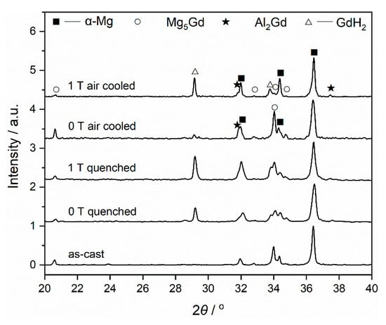 Air cooling was then used to exclude the effect of the magnetic field upon cooling. The XRD patterns of the air-cooled Mg-Al-Gd alloys after homogenization under 0 T and 1 T are shown in Figure 5. Since the magnetization force is too weak to bring visible impacts on the paramagnetic phase [17] within 20 min, one can hardly recognize the crystal orientation of either the α-Mg or the Mg5Gd from the XRD patterns of the quenched and air-cooled alloys (Figure 5). The air-cooled alloys were composed of α-Mg, Mg5Gd, Al2Gd, and GdH2, and the weight percentage of these phases is shown in Table 1. The phase constituent of the air-cooled alloy after homogenization under 0 T was close to that of the as-cast one, whereas the α-Mg grains began to reveal the feature of the dendrite (Figure 7b). When the alloy treated under 1 T was air-cooled, the α-Mg grains remained to be rosette-like (Figure 7d). This also proved that the solution treatment under the magnetic field has resulted in the refinement of the α-Mg grains.
