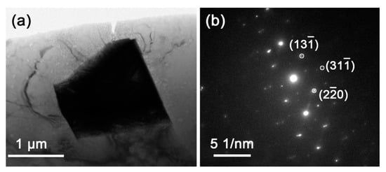 To figure out the effect of the magnetic field on the formation of the secondary phases upon cooling, quenching was used to freeze the high-temperature phase constituent and microstructure, and air cooling was used to exhibit the intermediate state between quenching and furnace cooling. The magnetic field was applied only at the homogenization stage, and the quenching and air cooling were under 0 T. Figure 5 shows the XRD patterns of the Mg–Al–Gd alloys quenched and air-cooled under 0 T and 1 T. A comparison was firstly made between the quenched Mg–Al–Gd samples to reveal the function of the magnetic field during the solution treatment. In addition to the α-Mg, Mg5Gd, and Al2Gd phases, both the quenched samples contained GdH2 hydride, which is commonly observed in the Mg-RE alloy [31]. The rare earth element may absorb atomic hydrogen to form a hydride in the water medium during quenching [32], and the formed GdH2 particles were reported to be cuboid or rectangle-shaped [31]. The formation of the GdH2 was also relative to the formation of the Mg5Gd upon cooling. It was the decomposition of the MgGdHx into Mg5Gd and GdH2 [33], and the coherent orientation relationship is (111) Mg5Gd // (111) GdH2 [31]. Therefore, the content of GdH2 was relative to that of Mg5Gd. For the quenched and air-cooled alloy at 1 T, the content of Mg5Gd was 9.41 wt.% and 8.69 wt.%, respectively. Correspondingly, the content of GdH2 was 9.56 wt.% and 9.01 wt.%, respectively. The TEM image of the quenched Mg–Al–Gd alloy under 1 T was shown in Figure 6a to distinguish the GdH2 and Al2Gd phase. According to the selected area electron diffraction (SAED) pattern, the particle in Figure 6a was identified to be the GdH2 phase. The size of the GdH2 was about 1 μm, much smaller than that of the Al2Gd phase (~10 μm). The Al2Gd particles have been confirmed to have positive effects on the enhancement of the strength of the Mg–Al–Gd alloys [22].