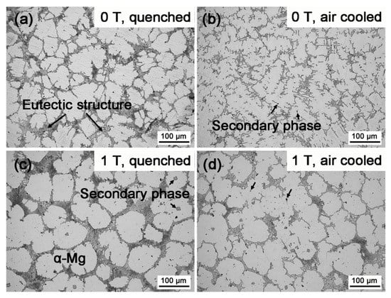 SEM images of the (a) quenched and (b) air-cooled Mg–Al–Gd alloys under 0 T, and (c) 1 T, and the air-cooled alloys under (c) 0 T and (d) 1 T.