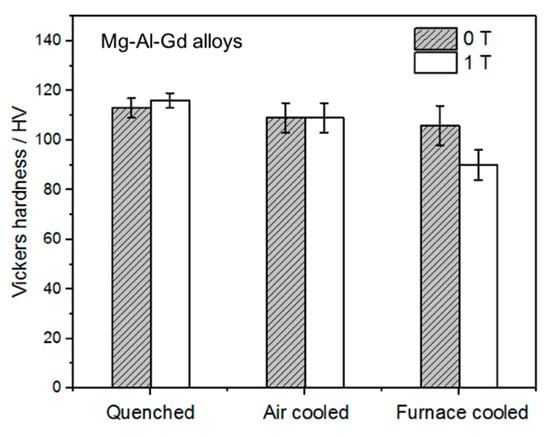 Vickers hardness of the quenched, air-cooled and furnace-cooled Mg–Al–Gd alloys under 0 T and 1 T.