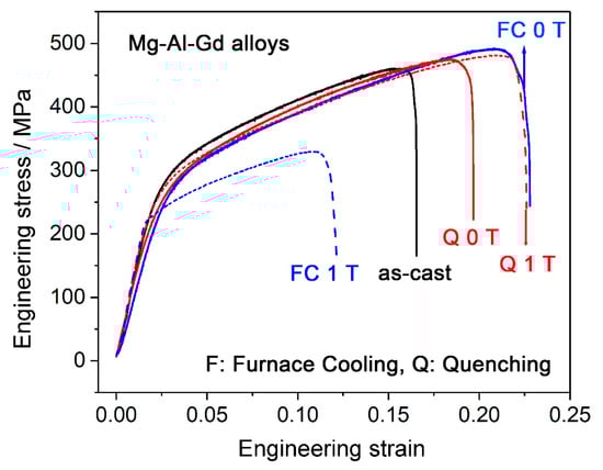 Compressive stress–strain curves of the as-cast Mg–Al–Gd alloy and the furnace-cooled and quenched alloys under 0 T and 1 T.