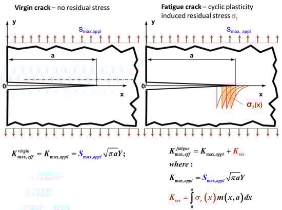 Prof. Grzegorz Glinka (Canada): “There is a lot emphasis put on the crack tip closure and the effective stress/SIF range. I would like to mention that residual stresses created by the crack tip cyclic plasticity have noticeable effect on the effective maximum stress intensity factor as well. The figure below shows two identical cracked components subjected to the same applied maximum stress Smax,appl. One component (on the left) contains virgin crack without any stress history and having zero stress at Sappl = 0 (beginning of the loading process). The stress intensity factor Kvirginmax,eff at the nominal stress level Sappl = Smax,appl is shown below. However, in the case of a propagating fatigue crack, there is residual stress field created by the cyclic loading when propagating the crack up to its length ‘a’. This residual stress σr exists even when the applied stress is Sappl = 0. The applied maximum cyclic stress is must be superposed on the pre-existing residual stress σr. Therefore, the local stress field ahead of the virgin crack will be different than the stress field ahead of the fatigue crack (right hand side of Figure 1). As a result the two effective stress intensity factors induced by the same applied maximum stress Smax,appl must be different as well, Kvirginmax,eff ≠ Kfatiguemax,eff.