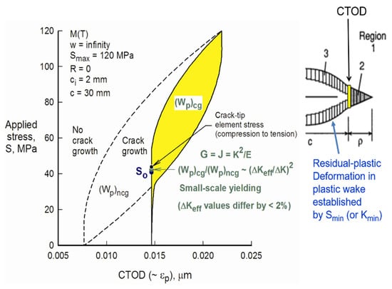 On the loading cycle, the crack-tip material has ‘no’ plasticity deformation until the crack tip opens (crack tip has large stress/strain concentration). (CTOD is only plastic deformation and is related to the cyclic plastic-strain range, which has been affected by crack closure.) Thus, above the crack-opening stress, the material begins to have plastic deformation. During the loading process, the crack grows by an increment ∆c (dc/dN per cycle). At Kmax, the increment ∆c has a large amount of plastic deformation and the growth increment (element) closes at a very high applied stress. (The yellow element in Figure 2 has now broken and becomes residual plastic deformation along the crack surface.)