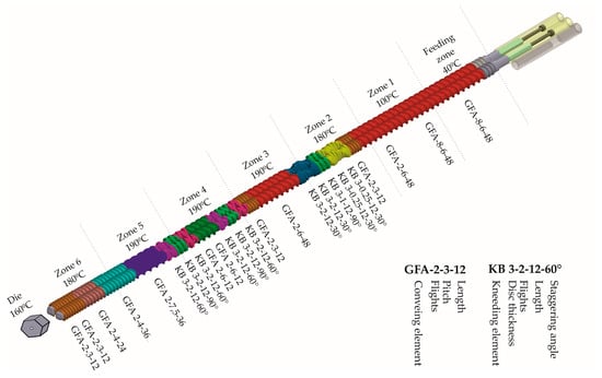Filaments were extruded using a 40D, 12-mm co-rotating twin-screw extruder (RES-2P/12A Explorer, Zamak Mercator®, Skawina, Poland) equipped with a gravimetric feeder MCPOWDER® (Movacolor®, Sneek, The Netherlands) and an air-cooled conveying belt (Zamak Mercator®, Skawina, Poland). The mixtures of itraconazole and matrix-forming polymers, of the composition presented in Table 1, and the total mass equal to 200 g were extruded through a 1.75 mm die at 160 °C. The feeding rate was set to approximately 70 g/h, which resulted in the linear filament extrusion speed of 25 m/h. The barrel temperature varied from 40 to 190 °C. The optimized temperature profile and screw configuration are presented in Figure 1.