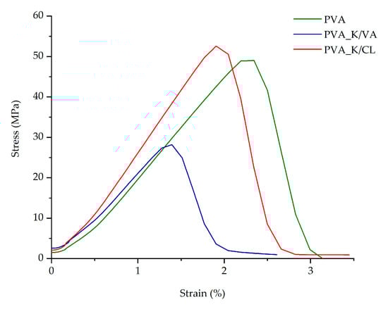 In Figure 2, the differences in the mechanical characteristics are presented. The Young’s modulus corresponds to the slope of the curve in the elastic behavior region.