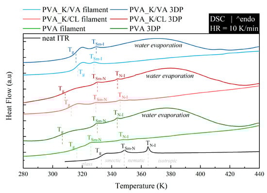 When the neat ITR is heated above its glass transition temperature, on the DSC thermogram, one can distinguish two endothermal processes associated with the liquid crystal (LC) phase transitions. The thermal event located at 348 K reflects transition from smectic (Sm) to nematic (N) LC alignment, while at 364 K, ITR loses the nematic order and becomes an isotropic (I) liquid. The performed experiments reveal that the employed polymers shift to lower temperatures for both Sm-N and N-I phase transition. The determined, based on calorimetric studies, values of Tg, TSm-N, and TN-I for all investigated systems are compared in Table 3. It is worth noting that in one of the examined systems (PVA_K/VA), regardless of the applied technological process, the lack of the nematic phase was observed (i.e., the N-I endothermal event was not registered by means of DSC).