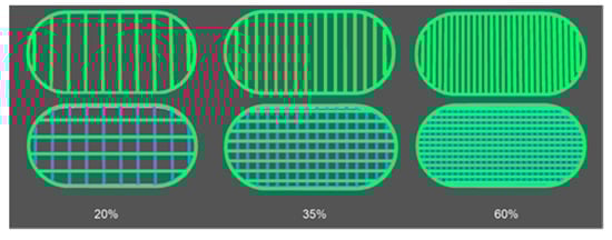 The Blender® 2.79b software was used to design the models of the oblong tablets (Blender Foundation, Amsterdam, The Netherlands). The basic model was 20 mm long and 10 mm wide. The model height varied from 2.4 to 3.65 mm, which was related to the number of 3D printed layers. Voxelizer® slicing software (version 1.4.18, ZMorph®, Wroclaw, Poland) was applied to define the height and the width of the single layer path. The 3D model was imported in stl format and divided into layers before printing. The thickness of the first layer was equal to 0.2 mm to improve the adhesion of the print to the printer bed, whereas the height of the subsequent layers was 0.15 mm. The path width was equal to the diameter of the printing nozzle, i.e., 0.4 mm. One outline and rectilinear infill (density of 20%, 35%, and 60%) were designed for the printing process. Each tablet was composed of 50 mg of ITR and 200 mg of polymer carriers (Table 1). The tablets were printed by an FDM ZMorph® 2.0 S personal fabricator (Wroclaw, Poland) equipped with a 1.75 mm commercially available printhead. Printing temperature was 205 °C. The tablets were printed with a 10–15 mm/s printing speed. The temperature of building platform was 40 °C.