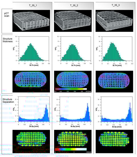 The phenomenon of path expansion between the cross-points can also be explained by the deviations of the structure thickness parameter in comparison with the theoretical value of 0.15 mm. This effect was observed for all degrees of infill; however, it was less pronounced in the systems with the higher infill density (Figure 6). The biggest difference was noticed in the case of T_20 tablets, for which the mean structure thickness was 100 µm higher than the theoretical layer height. For T_35 and T_60 tablets, the structure thickness was 40–50 µm higher. The differences in the structure thickness distribution are presented in Figure 6. The widest span of structure thickness was noticed for T_20 tablets and the structures with 0.25–0.35 mm thickness had the greatest volume within 3DP objects. On the contrary, the T_60 tablets exhibited the narrowest span, with structures of thickness varying between 0.15 and 0.25 mm highly represented within the object (Figure 6). Structure thickness distribution among a set of T_35 tested tablets was similar and showed good repeatability of printed dosage forms with 35% of infill (Table 6, Figure 7). Moreover, identical mean structure separation was observed within all T_35 tablets (Table 6) The porosity within T_35 tablets was similar, and histograms of structure separation distribution revealed that pores with size 0.8–1.0 mm are highly represented (Figure 7). Decreasing the tablet infill from 35% to 20% resulted in porosity changes. Pores with larger sizes, between 1.2 and 1.75 mm, are visible on the histograms and the total porosity increased from 58.5% to 67.2%. In the case of T_60 tablets, pore size did not exceed 0.5 mm and total porosity was almost 1.7 times smaller (39.9%) than T_20 (Figure 6). It should be emphasized that the volume of the open pore space within the 3DP T_20 tablet (485 mm3) is twice as high as the volume of the solid part of the tablet (236 mm3), whereas the volume of the open pore space of T_60 (134 mm3) is 1.5 times smaller than the solid part of the tablet (202 mm3). The tablet open space will promote the penetration of dissolution media through the tablet’s internal structure and will have an impact on its disintegration and dissolution behavior. The influence of the internal structure of 3D printed objects on their properties was highlighted and widely discussed by Nazir et al. in the comprehensive review of the various 3D printed lattice and cellular structures, their advantages and limitations [75].