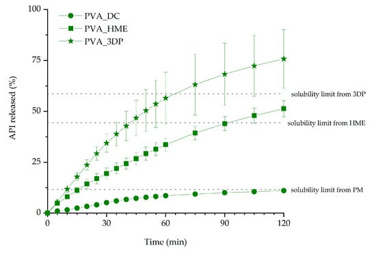 Itraconazole dissolution from 3D printed tablets with 35% infill was compared with the dissolution profiles obtained for the tablets made from milled extrudate (HME tablets) and directly compressed tablets (DC tablets) to evaluate the impact of the excipients and hot-melt extrusion on the dissolution of the API. Determined itraconazole solubility limits were equal to 5.8, 22.2, and 29.3 µg/mL for physical mixture, extrudate, and 3D printed matrix, respectively. The solubility limits were calculated as the percentage of ITR dose in tablets (11.6%, 44.4%, and 58.6% for physical mixture, extrudate, and 3D printed tablet, respectively) and are marked in Figure 8 to make the interpretation of the dissolution easier. It was found that the performed technological processes, namely hot-melt extrusion and 3D printing, affected the dissolution profile of itraconazole. The highest amount of the drug was dissolved from 3D printed tablets. The amount of ITR released from milled extrudate was significantly lower, while the smallest amount was released from directly compressed tablets (Figure 8). After 2 h of the dissolution test, 75.8%, 51.3%, and 11.0% of the itraconazole was released from the PVA-based 3D printed, hot-melt extruded, and directly compressed tablets, respectively. This relationship was confirmed for all the prepared formulations. It must be highlighted that in the case of all 3D printed formulations, i.e., PVA, PVA_K/VA, and PVA_K/CL, the amount of dissolved itraconazole was far above the solubility limit and the supersaturation lasted as long as the dissolution test was performed.