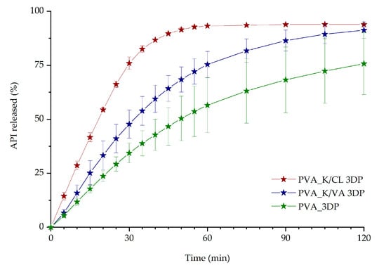 The impact of copovidone and crospovidone addition to the PVA formulation on the release profile was also evaluated (Figure 9). The best dissolution profile was noticed for PVA_K/CL 3D printed tablets. After 45 min, 91.5% of the API was dissolved from PVA_K/CL 3D printed tablets, while only 64.3% and 46.7% of the drug was released from 3D printed tablets with Kollidon® VA64 and PVA-based tablets, respectively.