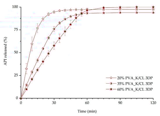 The impact of the infill density on the dissolution characteristics was evaluated for the PVA_K/CL formulation (Figure 10) as it was selected as the most promising formulation from all the prepared 3D printed tablets. Three rectilinear infills with different densities, namely 20%, 35%, and 60%, were evaluated. The results confirmed that the lower infill density favored faster dissolution of the API. After 45 min of the dissolution test, 96.9%, 89.7%, and 80.9% of the itraconazole was released from 3D printed tablets with 20%, 35%, and 60% infill, respectively.