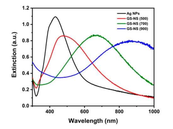 Figure 2 illustrates the extinction spectra of silver nanoparticles and GS-NSs prepared using three different amounts of K-Au solution. The uncoated silver nanoparticles exhibit a sharp LSPR peak at ~430 nm. Upon increasing the amount of K-Au solution, the Au shell thickness of the GS-NSs decreases, and the LSPR peak shifts to a longer wavelength. Specifically, the GS-NSs synthesized with a 1:1 ratio of silver nanoparticles to K-Au solution showed an LSPR extinction peak at ~500 nm. Upon increasing the amount of K-Au solution to 1:3 and 1:15 of silver nanoparticles to K-Au solution, the GS-NSs exhibited LSPR extinction peaks at ~700 and ~900 nm, respectively. The LSPR peak is highly tunable in its position and is strongly dependent on the size of the nanoshell as well as shell thickness [22]. Furthermore, shifts in the LSPR position of the GS-NSs also depends on the composition of the nanoparticles. The amount of gold in the GS-NSs is proportional to the amount of K-Au solution added into the silver nanoparticles’ suspension. Therefore, adjusting the silver and gold ratios in the GS-NSs can be achieved by varying the amount of K-Au solution, which ultimately can be used to tune the LSPR of the GS-NSs into the visible light to near-IR regions.