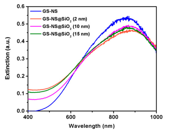 Extinction spectra of SiO2-coated GS-NS (900) with three different silica shell thicknesses.