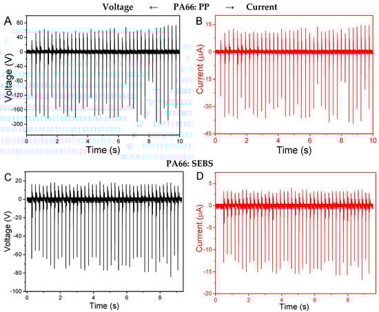 Among the different pairs of materials measured (Table 1B), Figure 2 illustrates, as representative examples, the triboelectric performance of PA66:PP, PA66:SEBS and Mica:30BT/PVDF. The output voltages per cycle of these pair of materials are between approximately 60 and 150 V (in average for 40 cycles) and the current generated per cycle ranges between 12 to 30 μA, for the same experimental conditions. Further, it is to notice that the 30BT/PVDF sample shows piezoelectric properties (due to the piezoelectric ceramic material) that contribute to a piezoelectric voltage generation in each cycle (mechano-electrical conversion), together with the triboelectric energy generation, as can be observed in Figure 3E,F. It is to notice that the piezoelectric voltage generation is small in comparison to the triboelectric contribution.