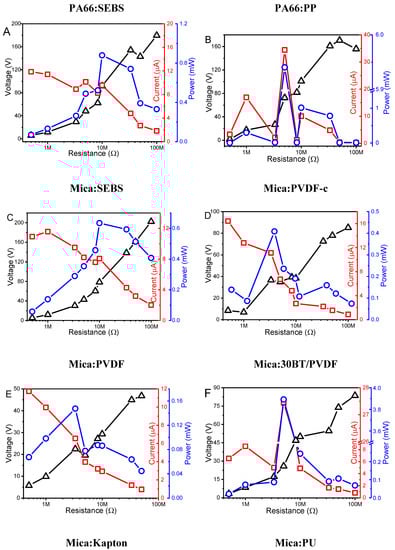 Triboelectric output voltage, current and power as a function of the load resistance for different material pairs: (A) PA66:SEBS; (B) PA66:PP; (C) Mica:SEBS; (D) Mica:PVDF-c; (E) Mica:PVDF; (F) Mica:30BT/PVDF; (G) Mica:Kapton and (H) Mica:PU.