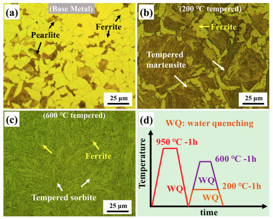 Optical microscopy observations of the microstructure of different samples: (a) base metal sample; (b) 200 °C tempered sample; (c) 600 °C tempered sample and (d) Schematic illustration of heat treatment.