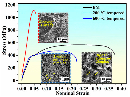 The tensile test results of BM, 200 °C tempered and 600 °C tempered samples at room temperature are shown in Figure 3 and Table 2. Zhang et al. [33] reported that the change of elongation with tempering temperature is contrary to that of the strength. The same result was also found in this study, as shown in Figure 3. The stress-nominal strain curves demonstrated that different heat-treated samples had different tensile performances. The yield strength was determined by the method of the 0.2% offset plastic strain [34]. It was found that the 200 °C tempered sample had the highest strength with yield strength of 850 MPa and ultimate strength of 1138 MPa, which resulted from high density dislocation and dislocation motion restricted by lath martensite boundaries [35,36,37,38]. As shown in Table 2, the yield strength of 600 °C tempered sample was 380 MPa, which was a little higher than that of the BM sample. This was attributed to the effects of precipitation strengthening due to the carbide precipitates distributed in the ferritic matrix. The BM sample had the largest strain (∼37%), clearly higher than that of the 200 °C tempered sample (less than 6%) and 600 °C tempered sample (less than 25%), and showed the best plasticity. For the 200 °C tempered sample, the dislocations started and slipped with difficulty, thus the elongation was the lowest with almost no work-hardening. Moreover, obvious yielding platform could be found in BM sample, which showed typical discontinues yielding processes. Nevertheless, obvious yielding platforms could hardly be found during the fracture process of 200 °C tempered and 600 °C tempered samples, indicating clearly continuous yielding processes (Figure 3). It was found that as the tempering temperature increased, the elongation increased and the strength decreased. According to the above discussion, it was known that the decrease in strength could be prevented by tempering at lower temperature (200 °C) [39].
