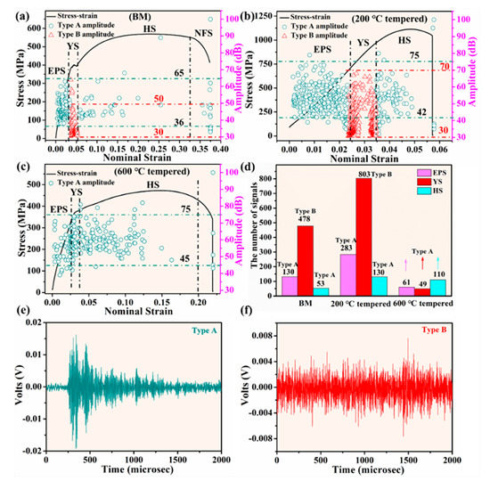 The acoustic emission (AE) amplitude and stress versus nominal strain of different samples, (a) BM sample [27]; (b) 200 °C tempered sample; (c) 600 °C tempered sample; (d) Number of signals; AE signal waveforms, (e) burst-type signal (type A) and (f) continuous-type signal (type B), adopted from [27].