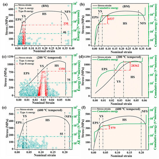 AE energy and cumulative AE energy versus nominal strain of different types of samples, (a,b) BM sample; (c,d) 200 °C tempered sample; (e,f) 600 °C tempered sample.